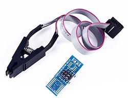 ICテストクリップ作成済みフルセット、チップを挟んで接続を引き出す便利なテストツール、適合チップパッケージ:1.27mmピッチSOP-8、幅:150〜200MIL、接点材料: 銅合金、ケーブル:全長約30cm、IDC 2x4コネクタ、変換モジュール:DIP-8とSOPの変換、表記価格:1