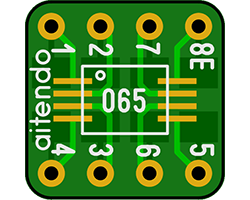 ピッチ変換シリーズ、ガラスエポキシ基板、FR-4、0.65mmピッチを2.54mmピッチDIP-8へストレート変換、基板寸法:10.3x10x1.2mm、対応表面実装部品は1206サイズ、表記価格:1パック=10枚入り