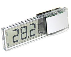 透明温度計ユニット、動作電源: ボタン電池AG10/LR1130(x1)※電池付属なし、温度範囲:-10℃〜+70℃、精度:±0.5℃、解析率:0.1s℃、外形寸法:70 x 20 x10 mm、表記価格:1