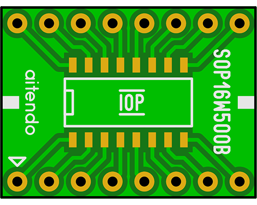 ピッチ変換基板、センター目印付き、ガラスエポキシFR-4、すずめっき、レジスタ色:緑色、適合ICパッケージ:SOP-16、1.27mmピッチ16P、IC body width:3.9 mm、変換先:2.54mmピッチ16P、スルーホール、φ0.9、DIP-16、穴幅:12.7mm、外形寸法:20.32x15.24x1.2mm、表記価格:1パック=2枚入り