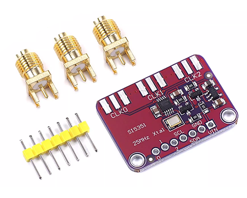 MS5351Mを搭載した汎用クロックジェネレータ、Si5351の代替品として使用できます。出力範囲:3ch、3Vpp、8KHz〜160MHz、制御インターフェース:I2C、動作電源:2.5〜3.3V、SMAコネクタ&ピンヘッダ標準付属、基板寸法:30 x 22 mm、表記価格:1