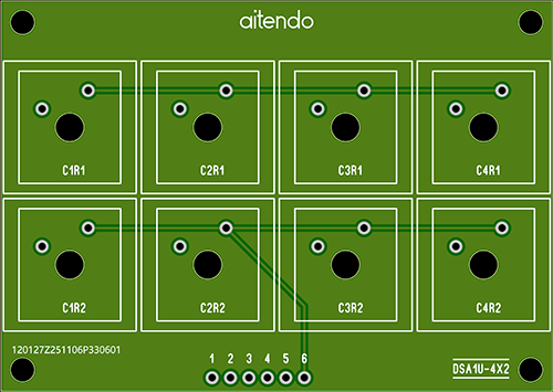 メカニカルK/Bスイッチ基板、基板単体、スイッチ別売、4x2マットリックス、接続:2.54mmピッチ、基板寸法:76 x 54 mm、表記価格:1