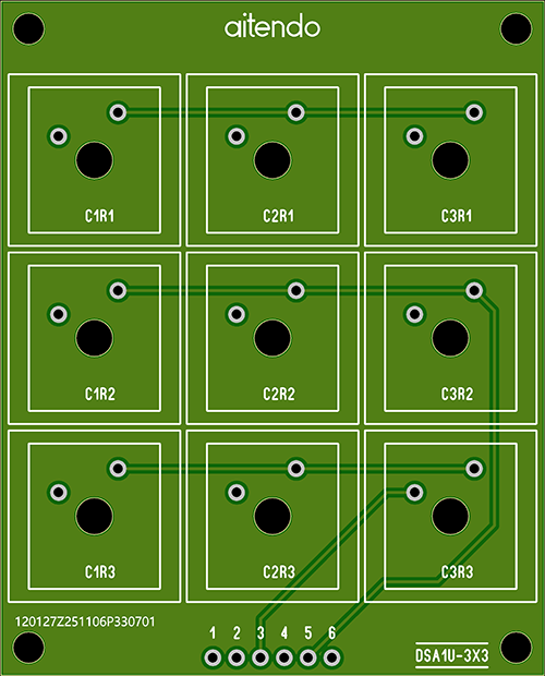 メカニカルK/Bスイッチ基板、基板単体、スイッチ別売、3x3マットリックス、接続:2.54mmピッチ、基板寸法:72 x 58 mm、表記価格:1