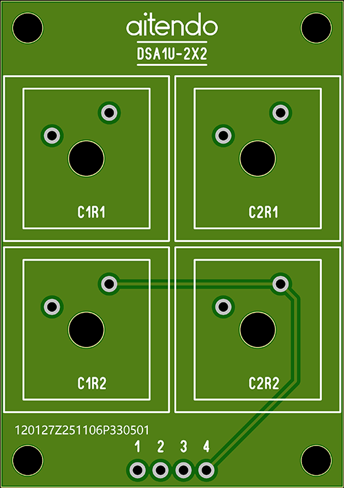 メカニカルK/Bスイッチ基板、基板単体、スイッチ別売、2x2マットリックス、接続:2.54mmピッチ、基板寸法:54 x 38 mm、表記価格:1