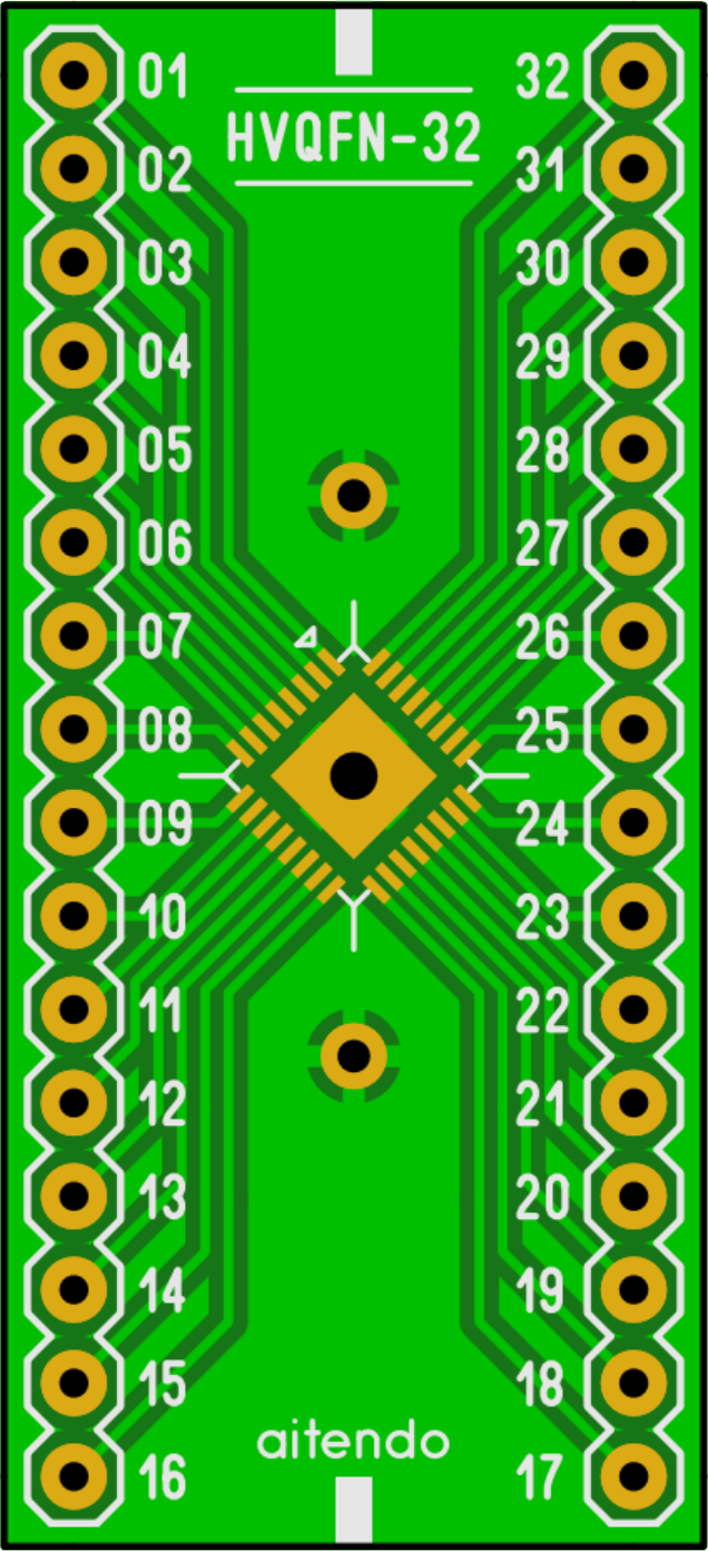 ピッチ変換基板、センター目印付き、ガラスエポキシFR-4、すずめっき、レジスタ色:緑色、適合ICパッケージ:HVQFN-326、0.5mmピッチ32P、IC body size:5 x5 mm、変換先:2.54mmピッチ32P、スルーホール、φ0.9、DIP-16、穴幅:15.24mm、外形寸法:41.91x19.05x1.2mm、表記価格:1
