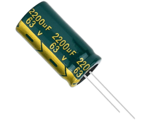 電解コンデンサ、中国製、CHONGX 63V 2200UF、外形寸法:φ18x35、ピッチ幅:7.5 mmm、表記価格:1