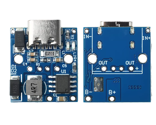 充電・昇圧一体化DCモジュール、充電部:TP4056搭載、充電電流:700mA、満了電圧:4.2V、1セル18650対応、保護回路付き、入力電圧:5V、TYPE-Cコネクタ、出力電圧:6V、最大出力電流:0.5A、基板寸法:18 x 22 mm、表記価格:1