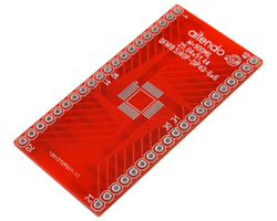 ピッチ変換基板、ガラスエポキシFR-4、レジスタ色:赤色、すすめっき、QFN側:0.5mmピッチ40P、チップボディーサイズ:6.0x6.0mm、変換先:2.54mmピッチDIP-40、外形寸法:51.5x26mm、表記価格:1